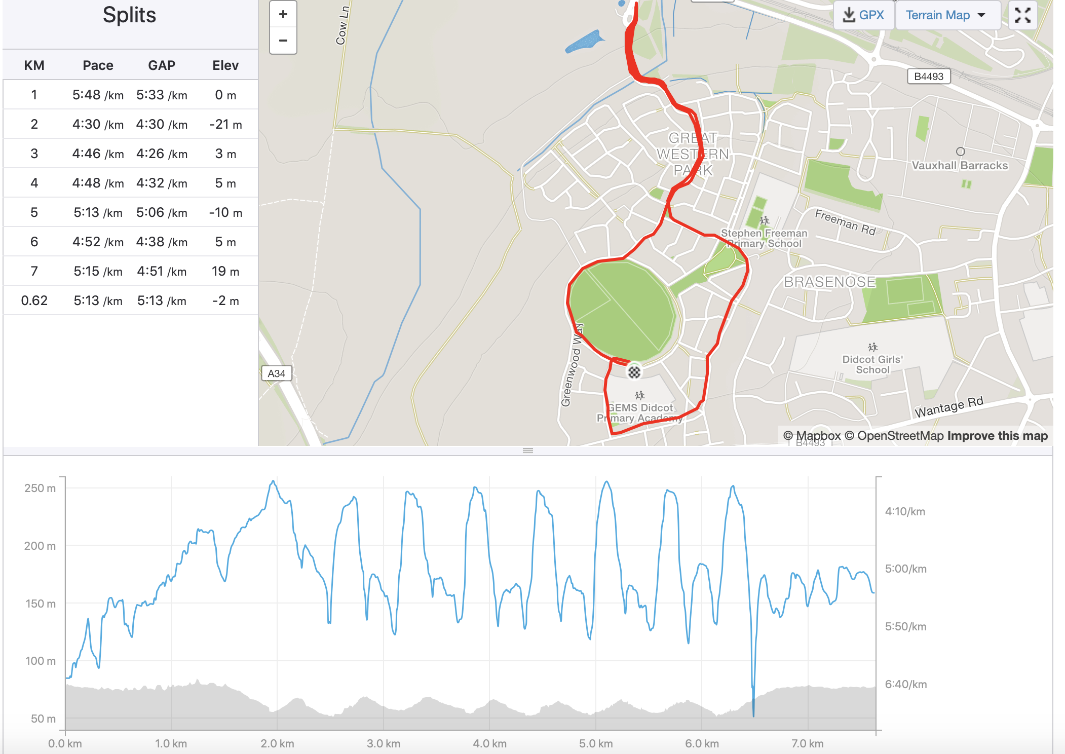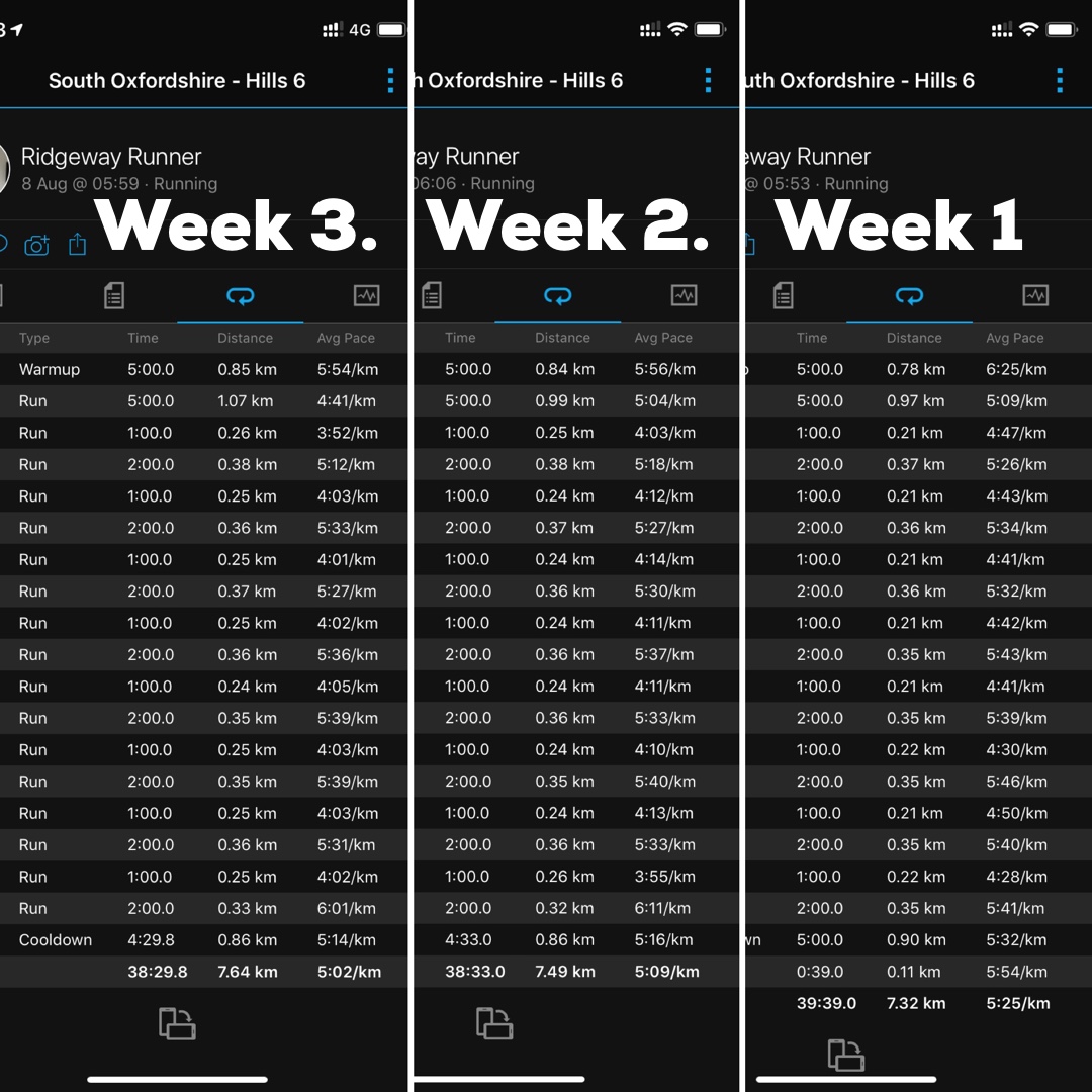 Thursday was a another repeat of the weekly hills session. That’s three weeks now with good progress across each week as is shown on this: