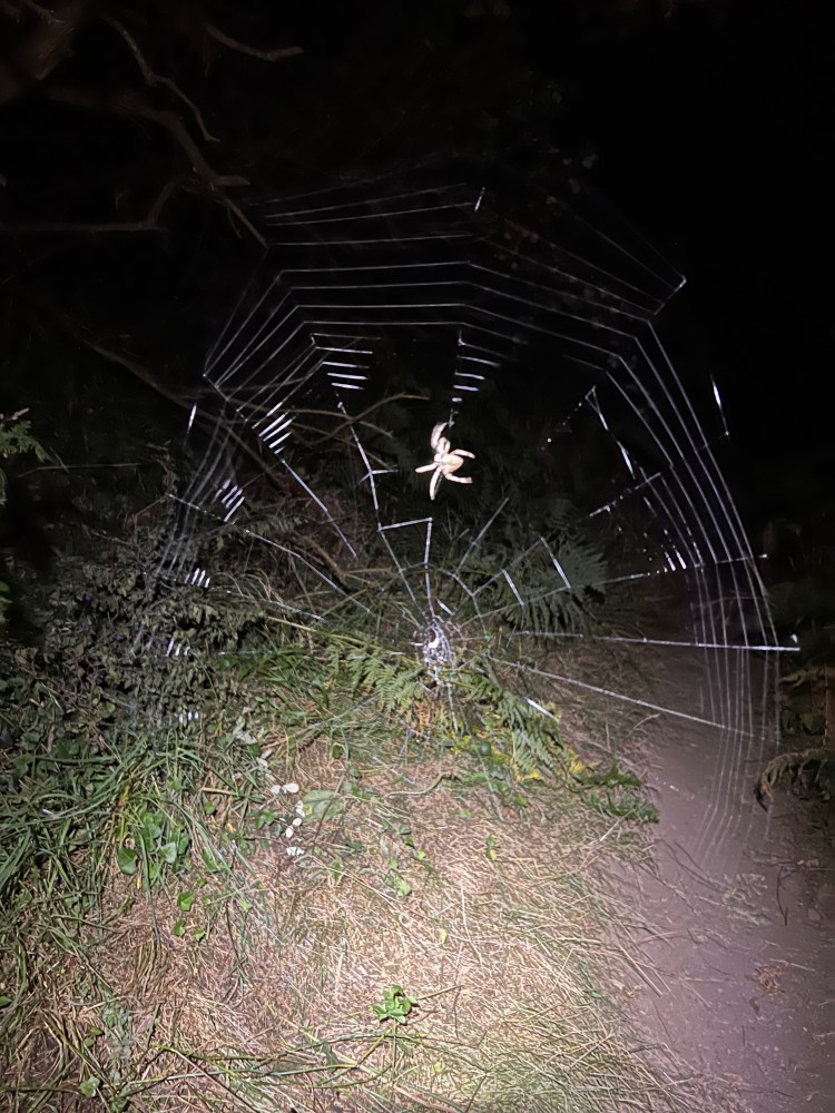 Firstly, at this time of year, and in the middle of the night, all the spiders come out. Spreading their massive webs across the path to catch moths etc, many of them caught this runner that night. I encountered dozens, a good few I spotted only as I hit the web, with many being brushed off my torso, head and the occasional (well 2) which were unfortunate to find their way into my mouth – urgh!!!